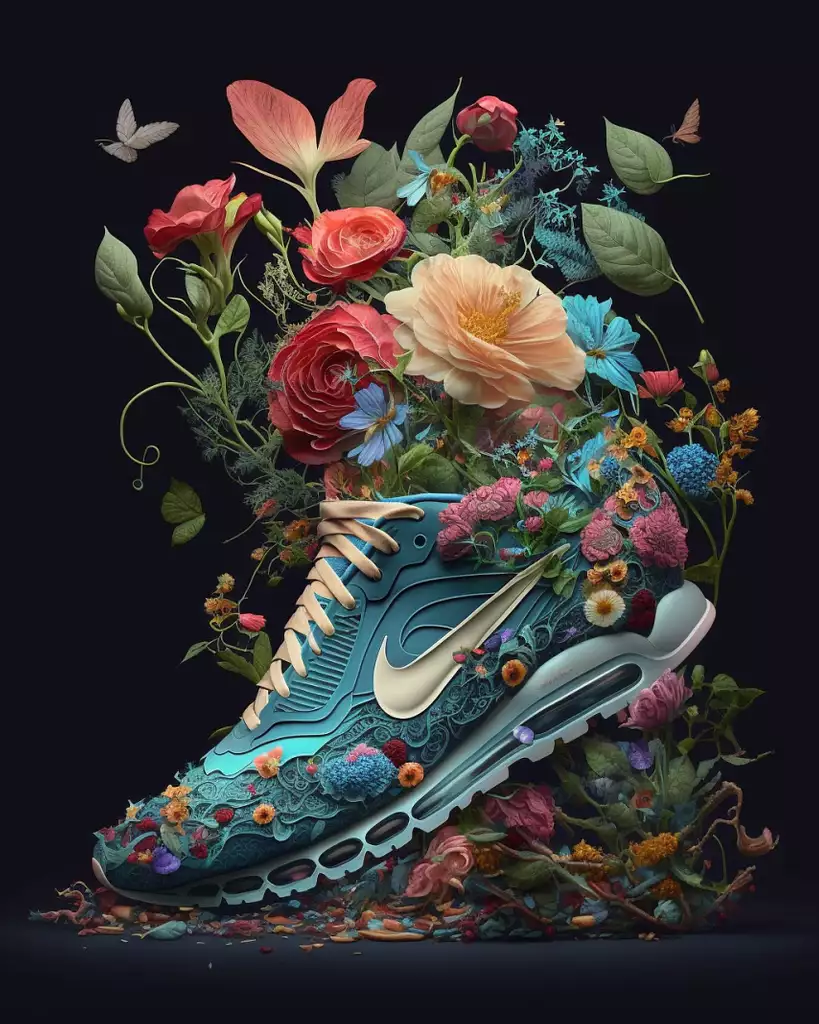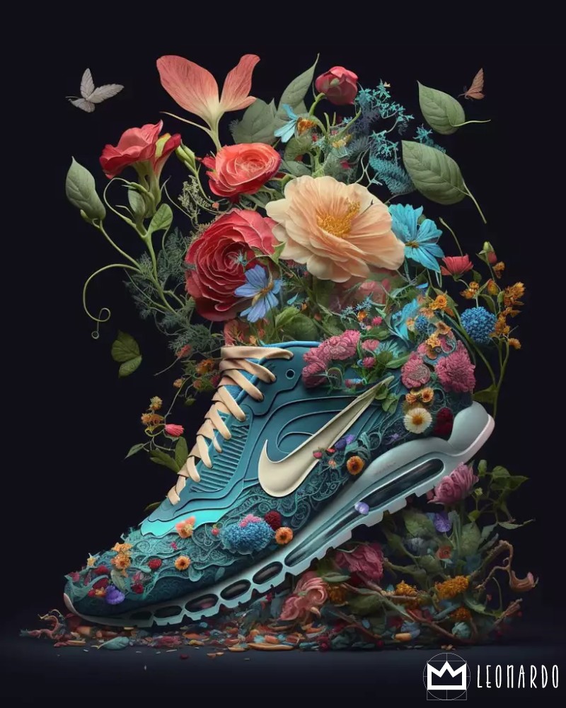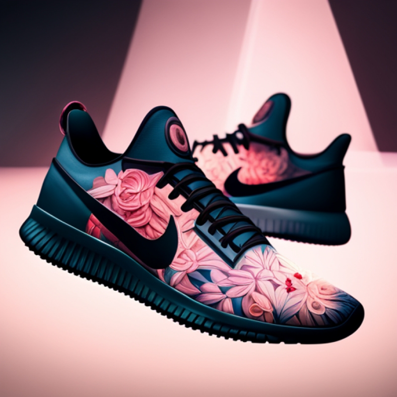 sneakers with silicone soles, nike logo in the shoe, design, flowers, insanely detailed, 8k --ar 4:5