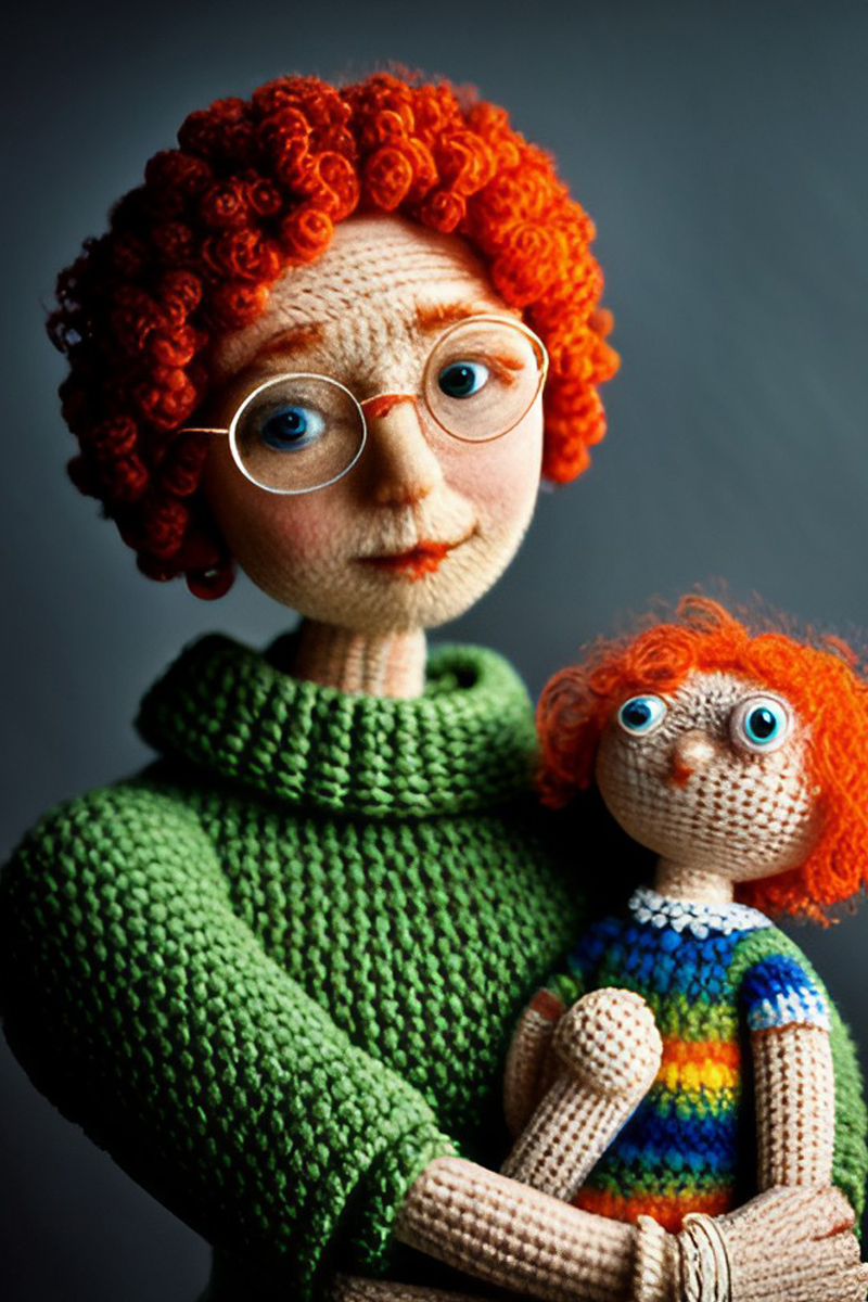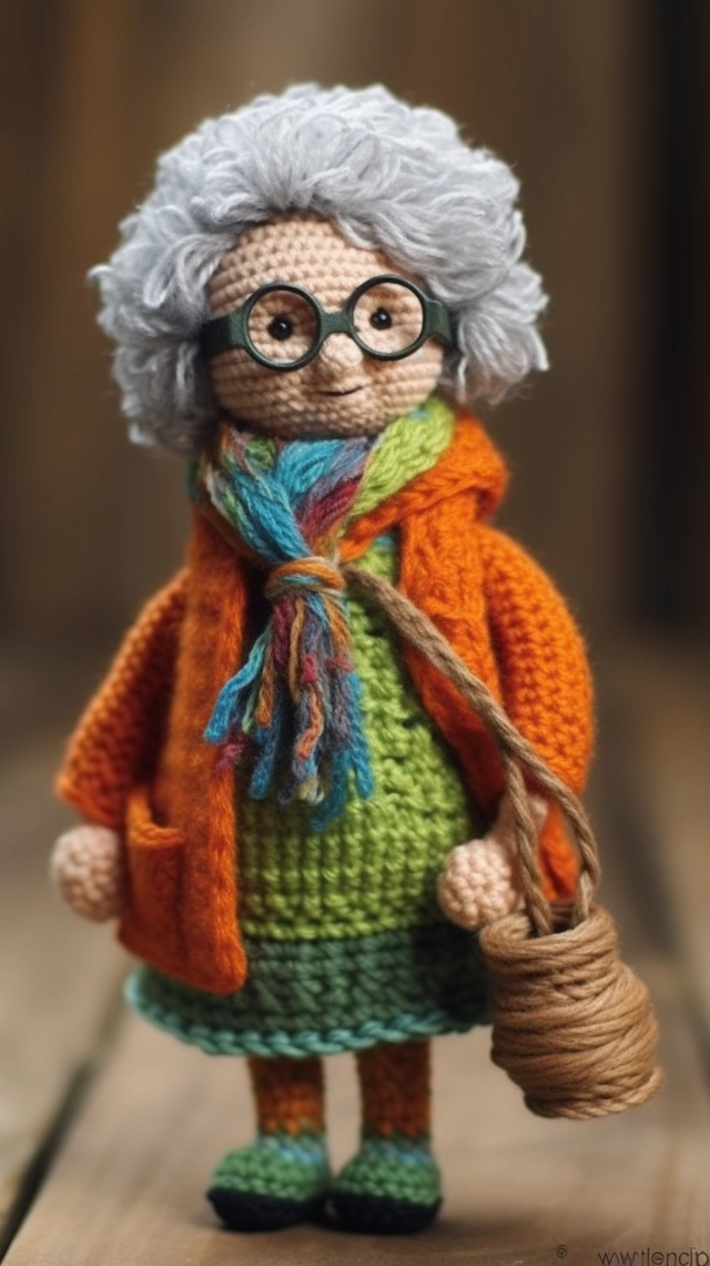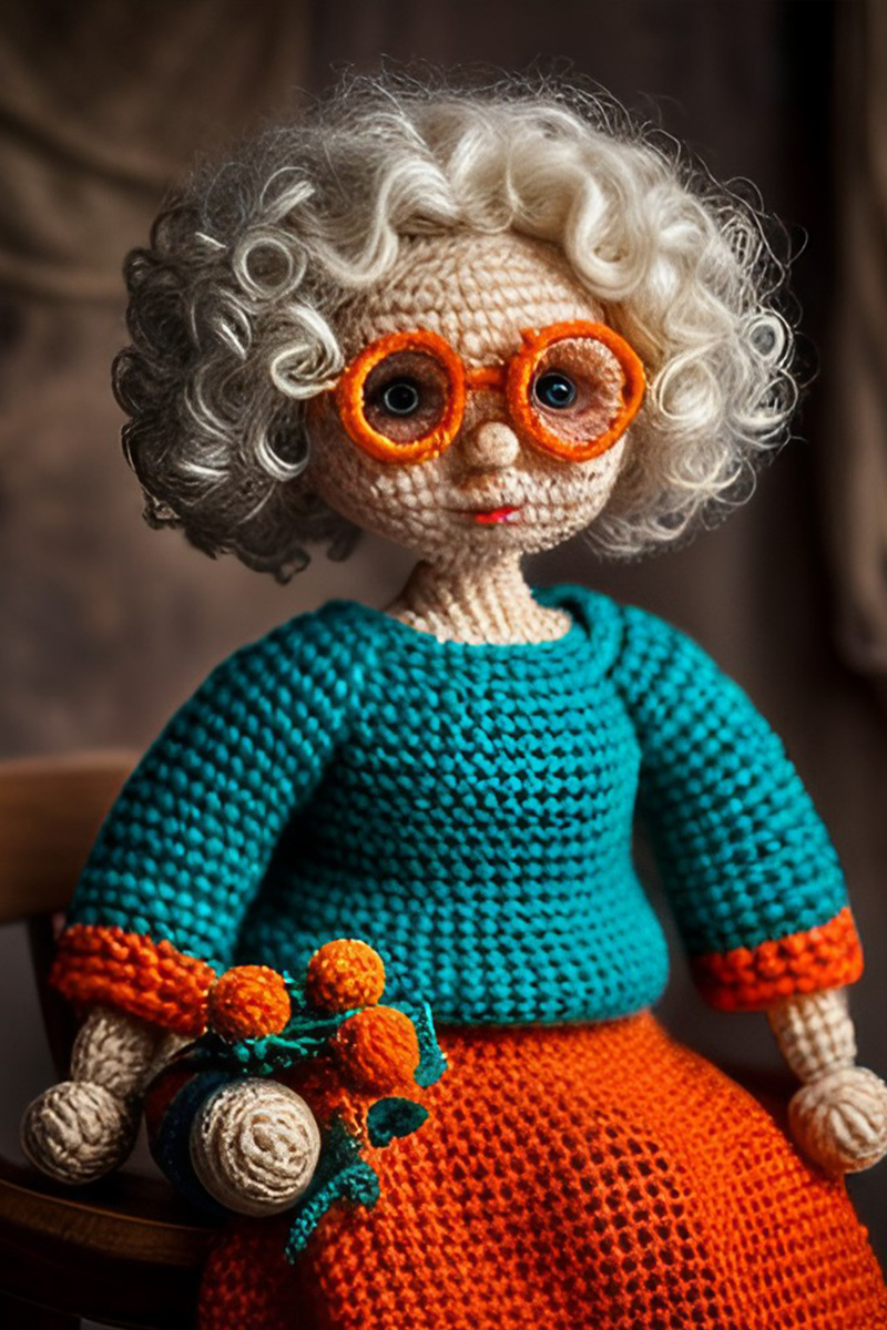 crotchet doll, with a green, blue and white dress, and an orange sweater, with tiny glasses made of metal wire. The doll resambles a beautiful grandmother.