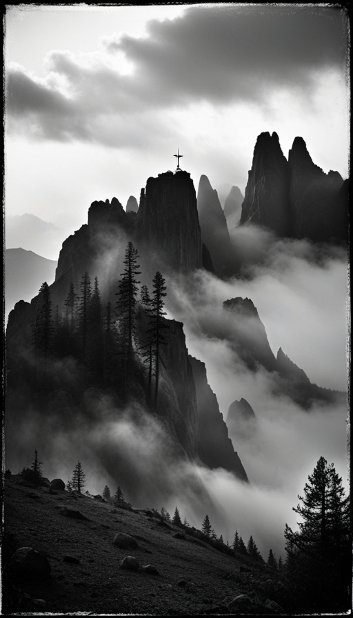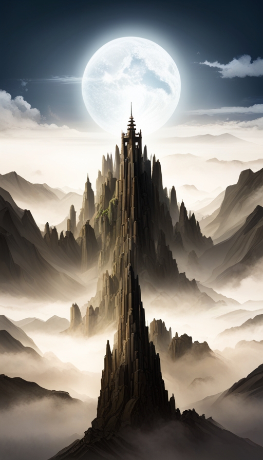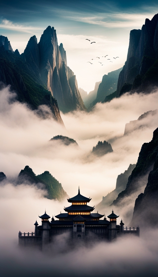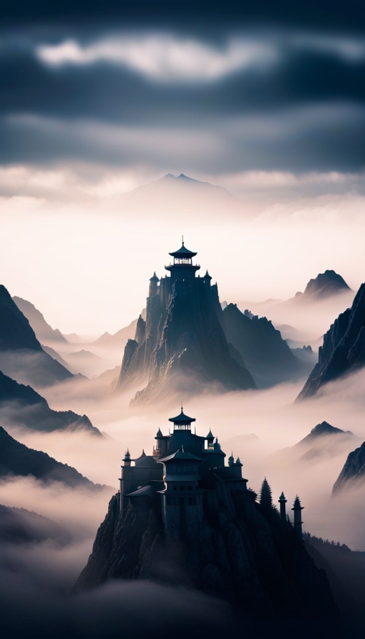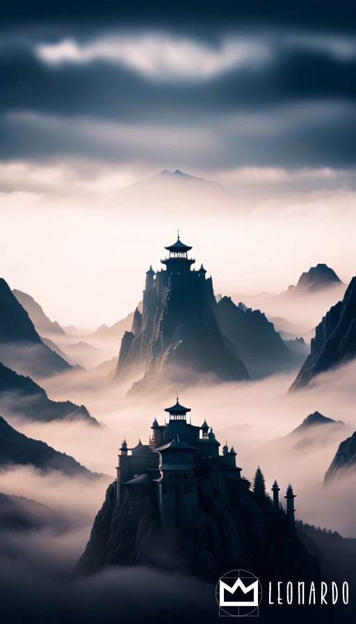 Ancient, mysterious temple in a mountain range, surrounded by misty clouds and tall peaks