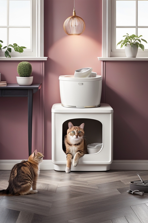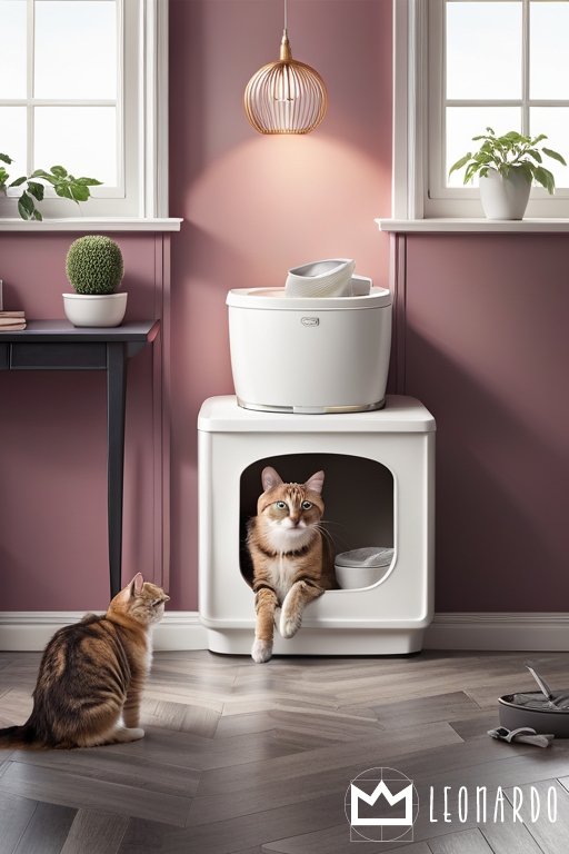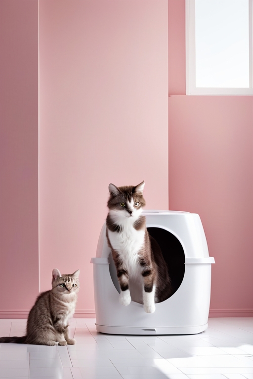A charming commercial shot featuring a cat litter box against a clean pastel backdrop, with the cat playfully exploring the surrounding space. The pastel backdrop enhances the cleanliness and freshness associated with the litter box, while the cat's presence adds a sense of liveliness and joy. Photographed by Massimo Listri, using a digital medium format camera, the lighting is a mix of soft diffused light and gentle highlights, capturing the dynamic interaction between the cat and the litter box.