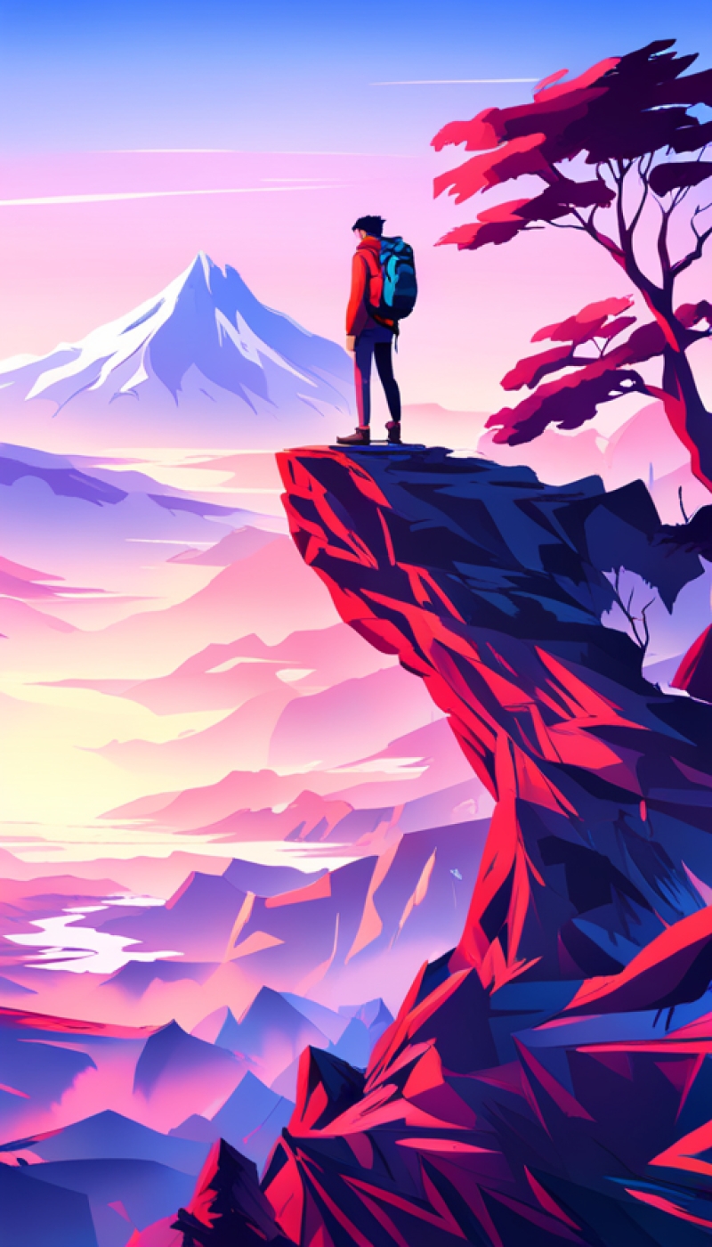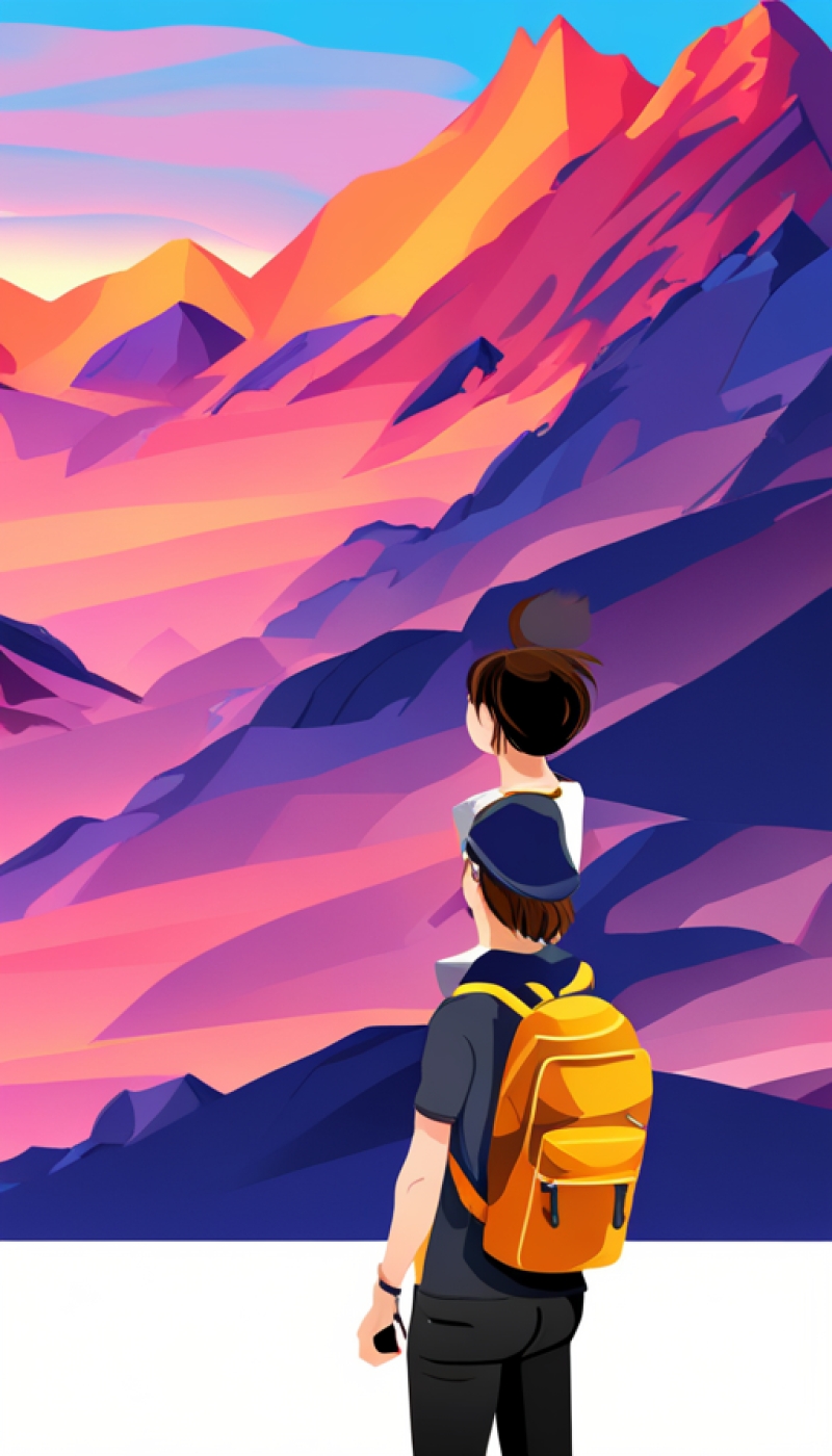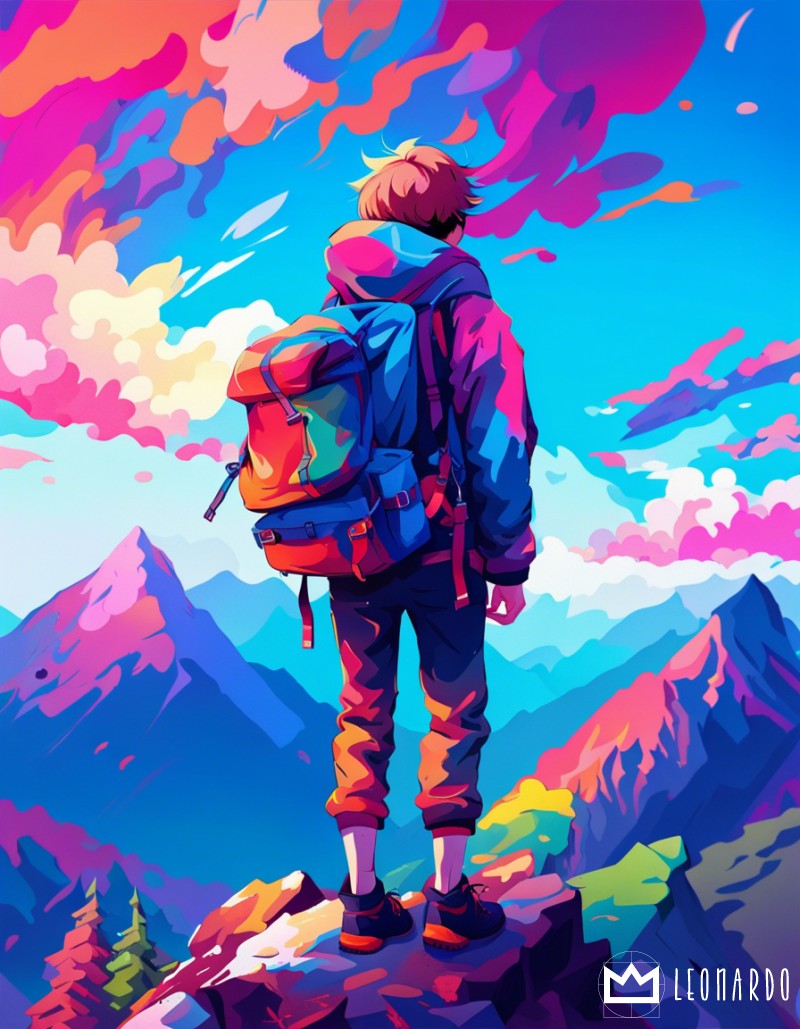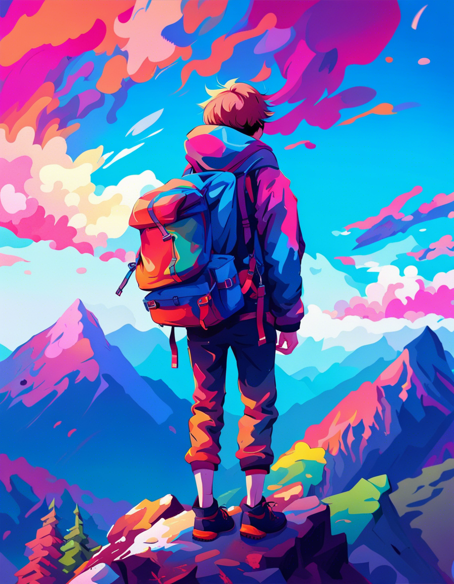 person with backpack standing on top of mountain, in the style of vibrant palette, anime art, 32k uhd, painted illustrations, high resolution
