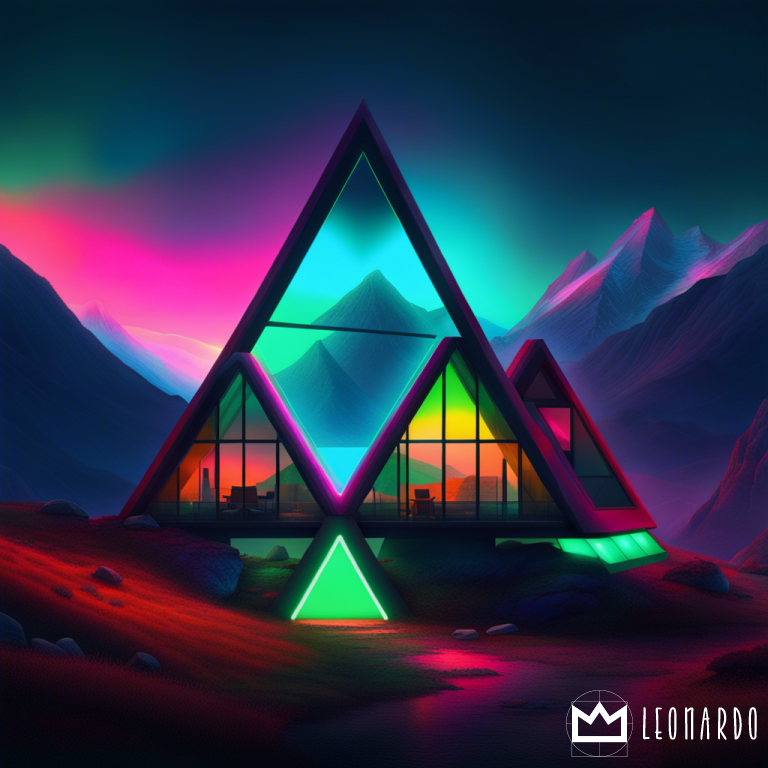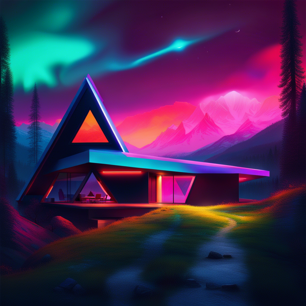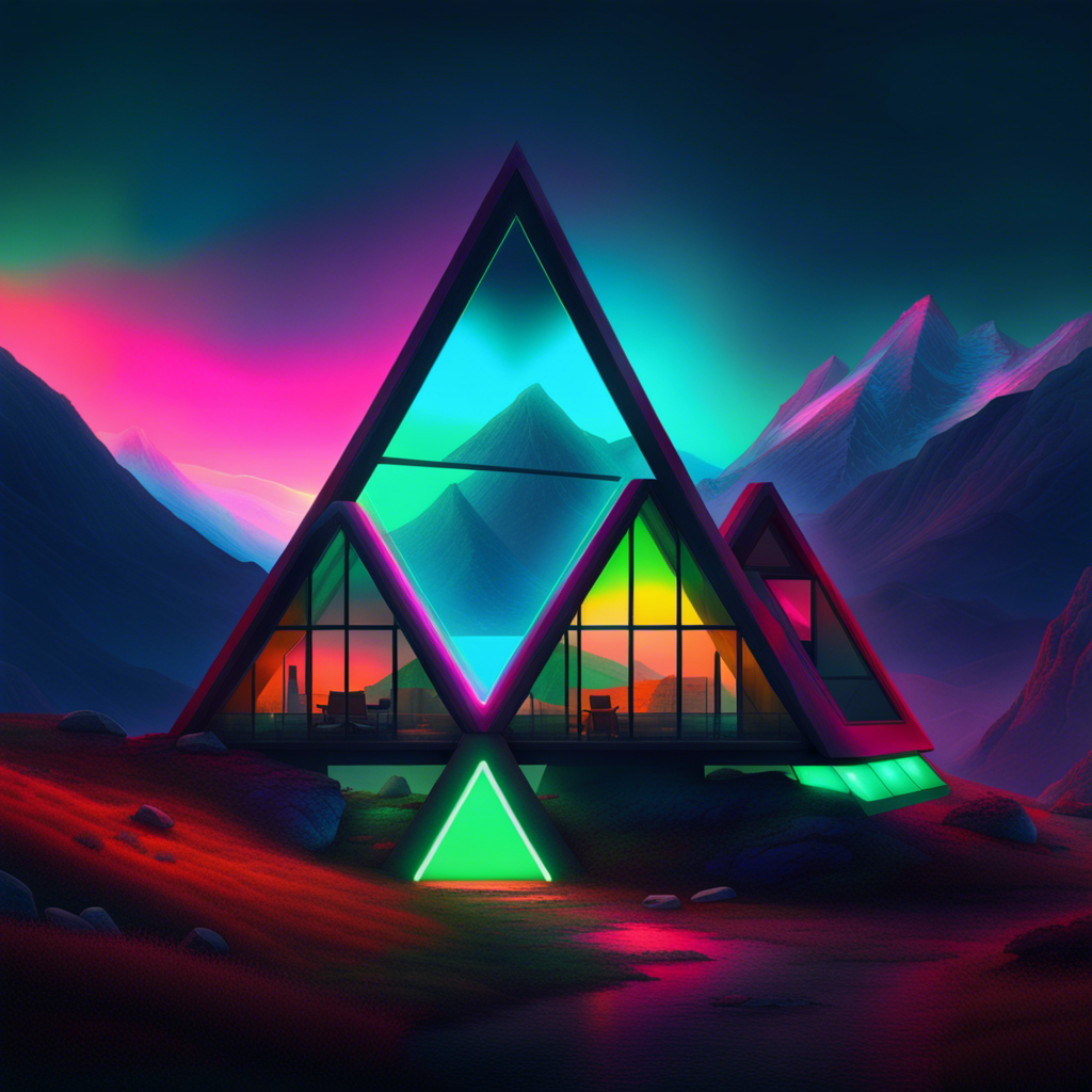 a glowing neon triangle shaped futuristic house in the mountains, aesthetically pleasing views, super cool, ultramodern, futuristic, symmetrical, wild colors, vibrant, glass, Albert Bierstadt, Ralph Blakelock, Romaine Brooks