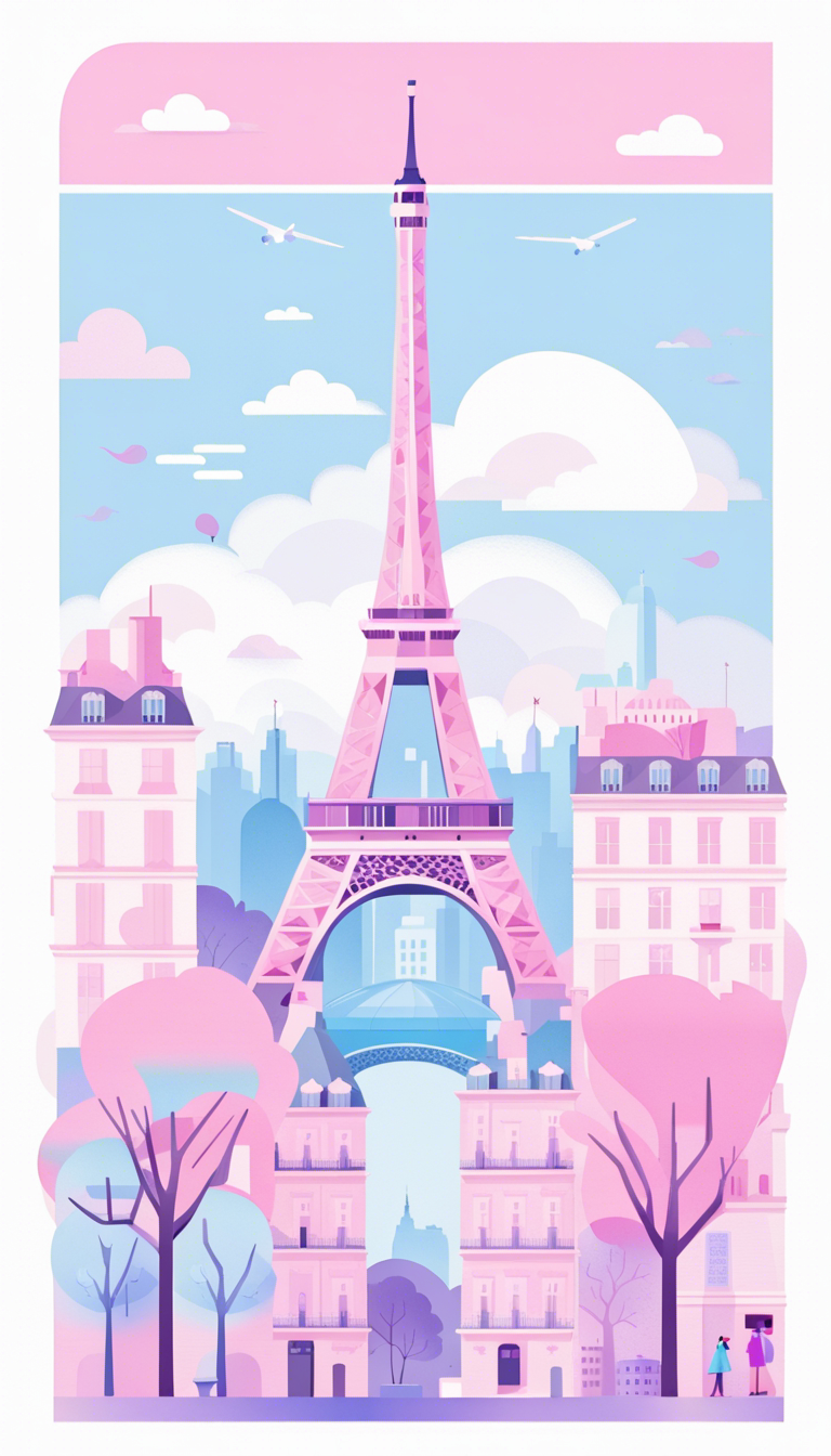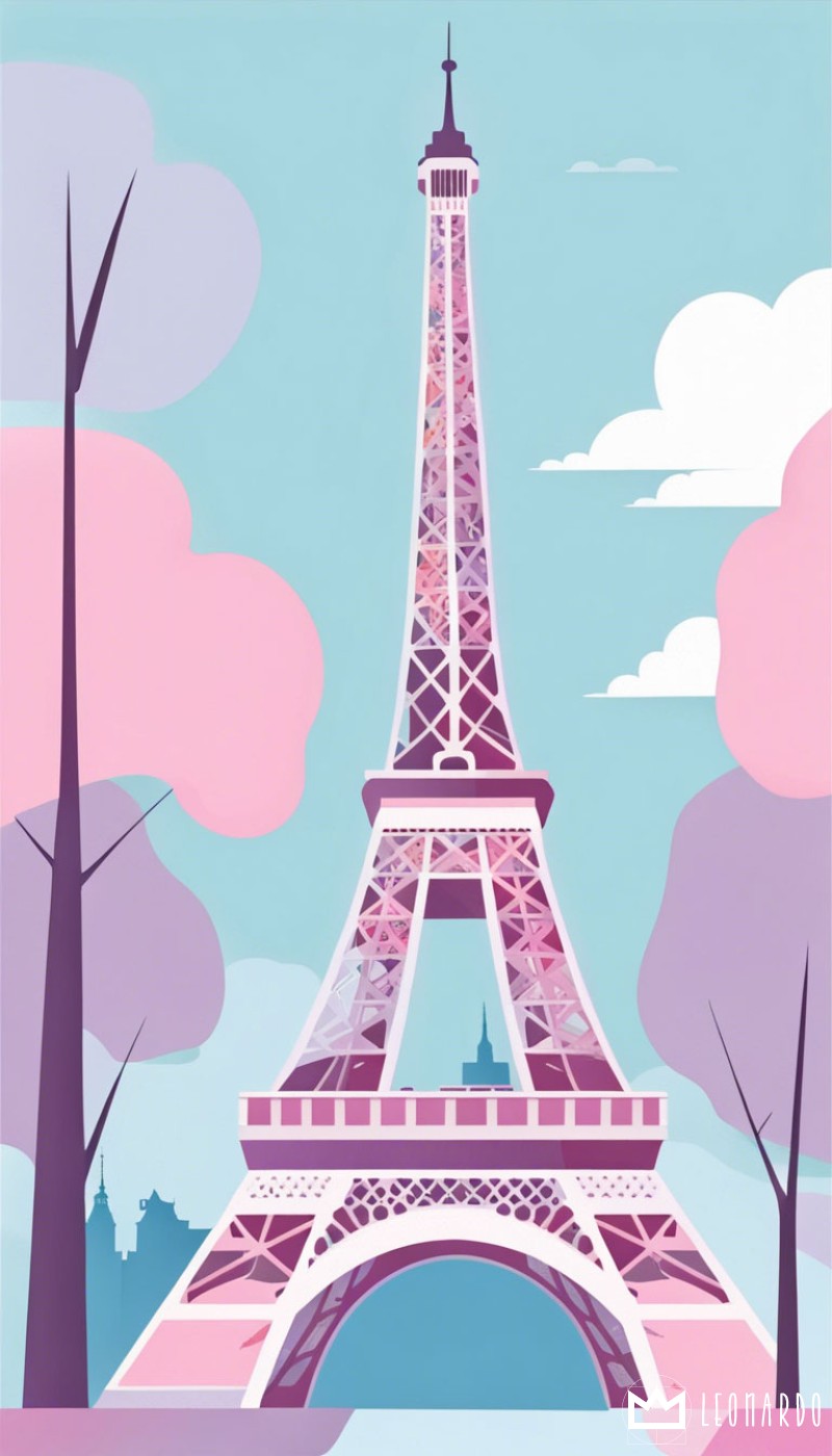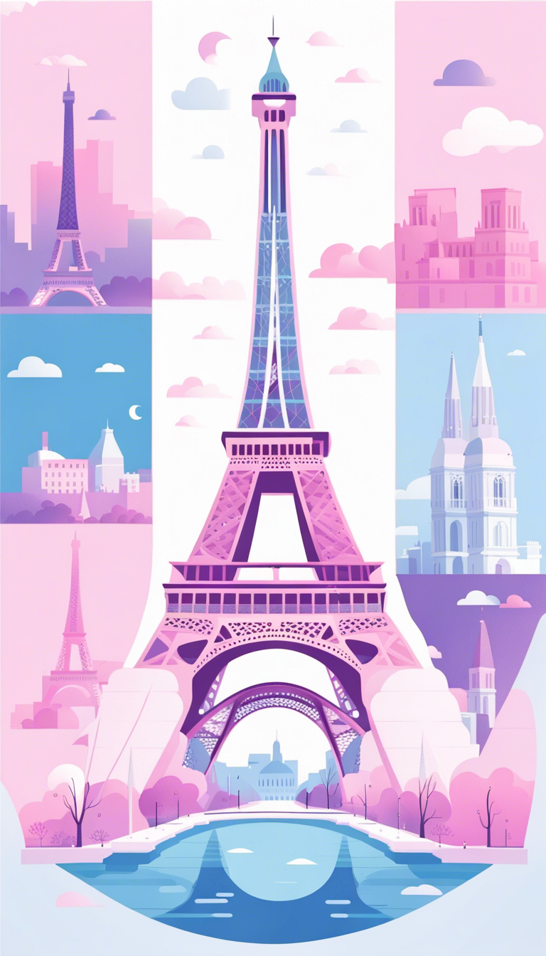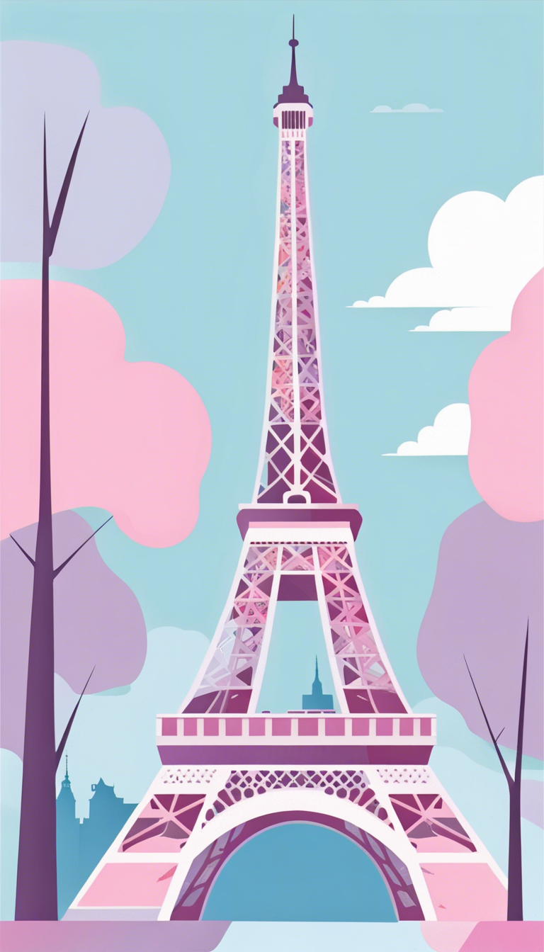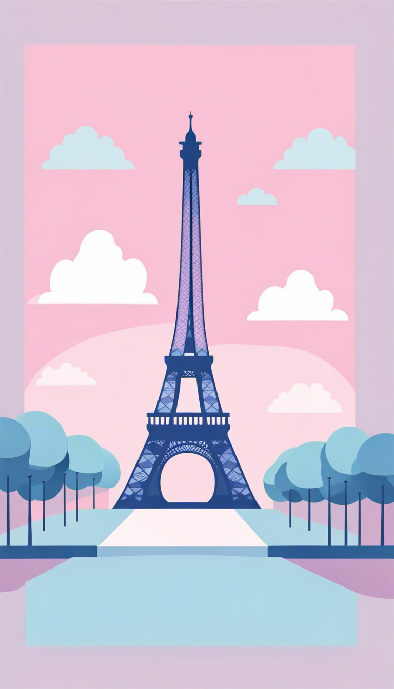 Flat vector art illustration, flat color, Eiffel Tower Paris, pastel blues, pinks and purples, wide angle