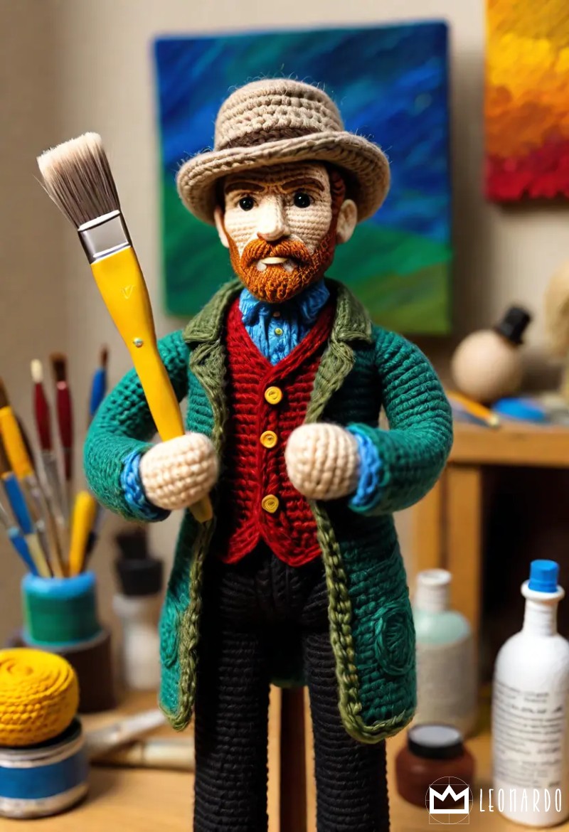 crochet doll of Vincent VanGogh HOLDING PAINTBRUSH in art studio