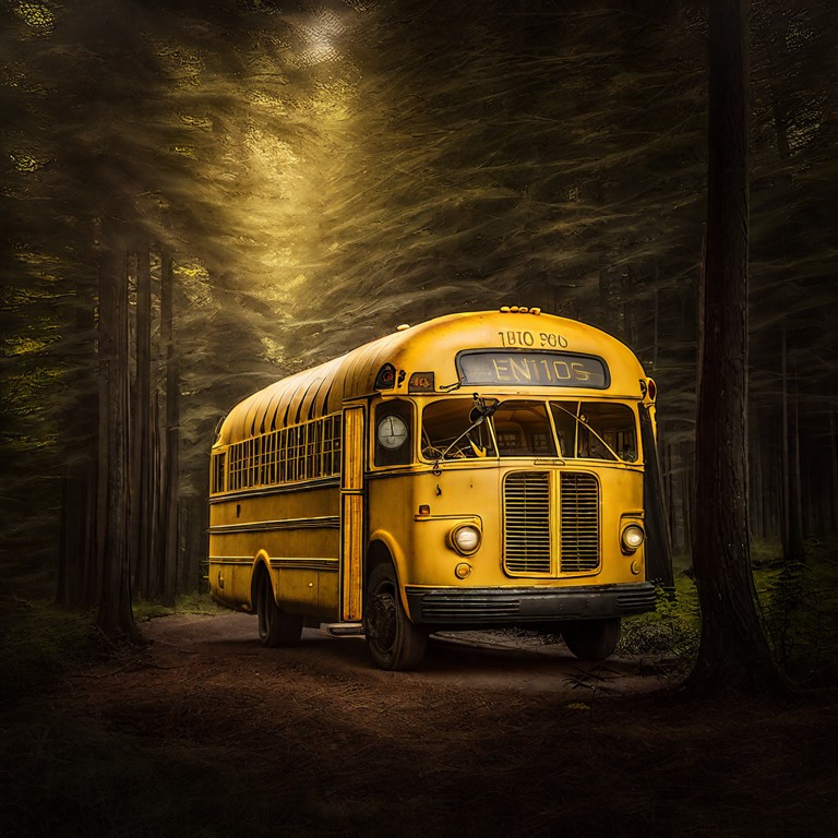 Old yellow school bus real photo from the front in the forest ultra realistic